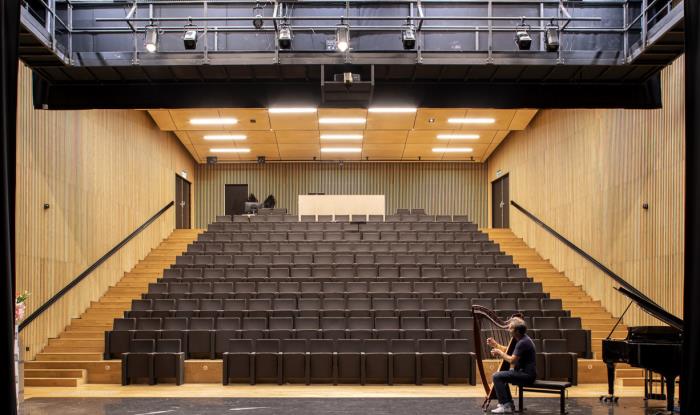- l’acoustique interne (réverbération) a été particulièrement travaillée notamment dans la salle de spectacles qui est conçue avec une acoustique variable en fonction des usages : représentation de formations orchestrales, petits ensembles (musique de chambre), théâtre, danse et concerts sonorisés.
