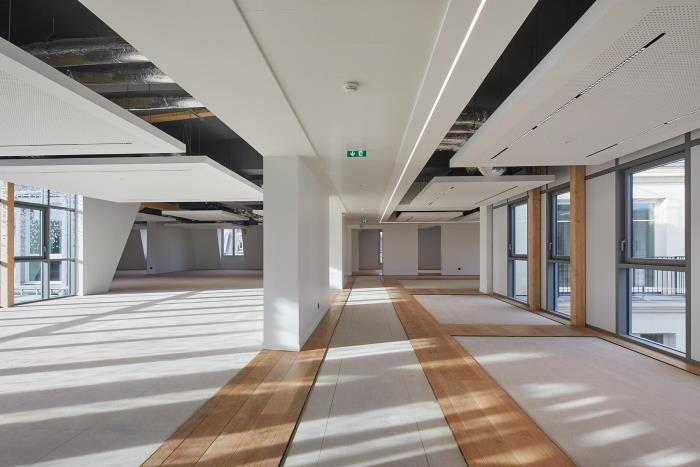 - Le traitement de la réverbération des plateaux de bureaux au moyen de larges îlots acoustiques afin de conserver une hauteur sous-plafond généreuse ;