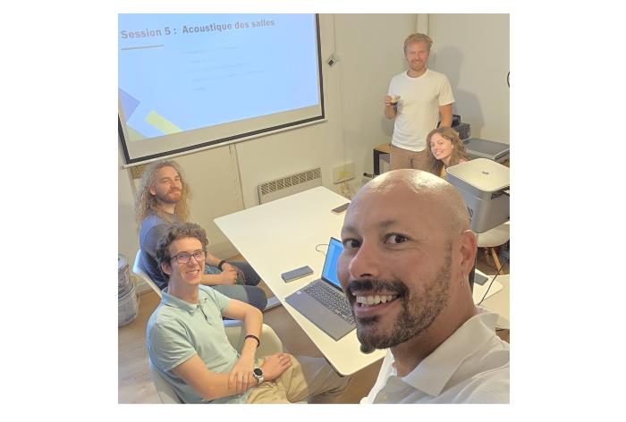 Voici une photo de notre Ă©quipe lors dâune rĂ©union interne dĂ©diĂ©e Ă l'acoustique des salles.